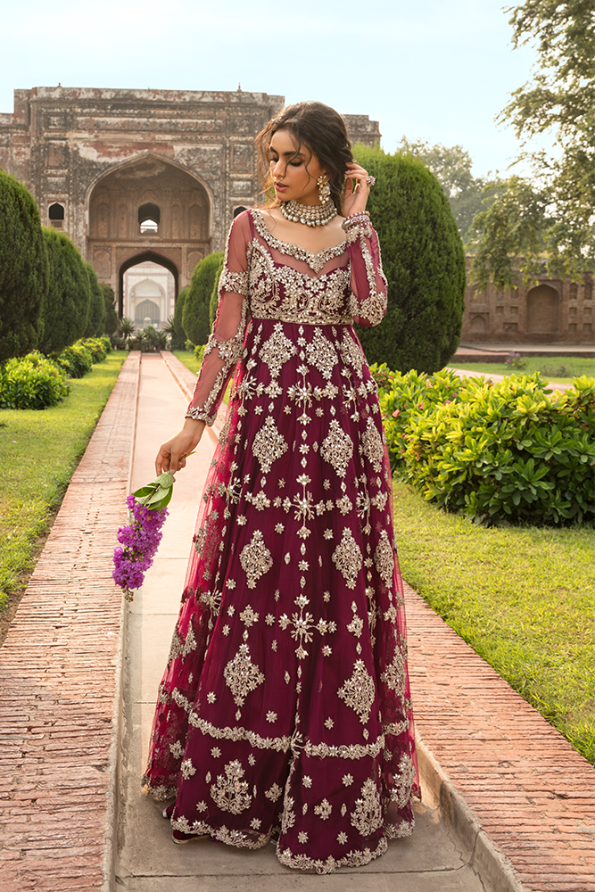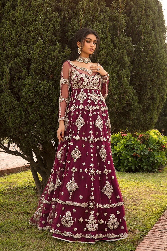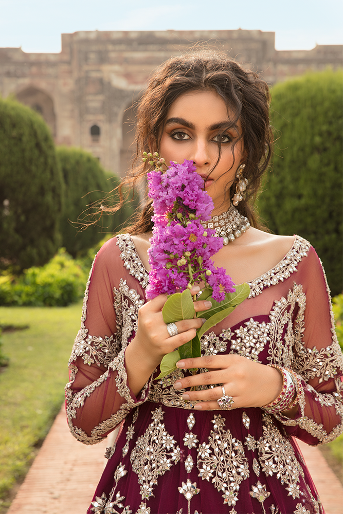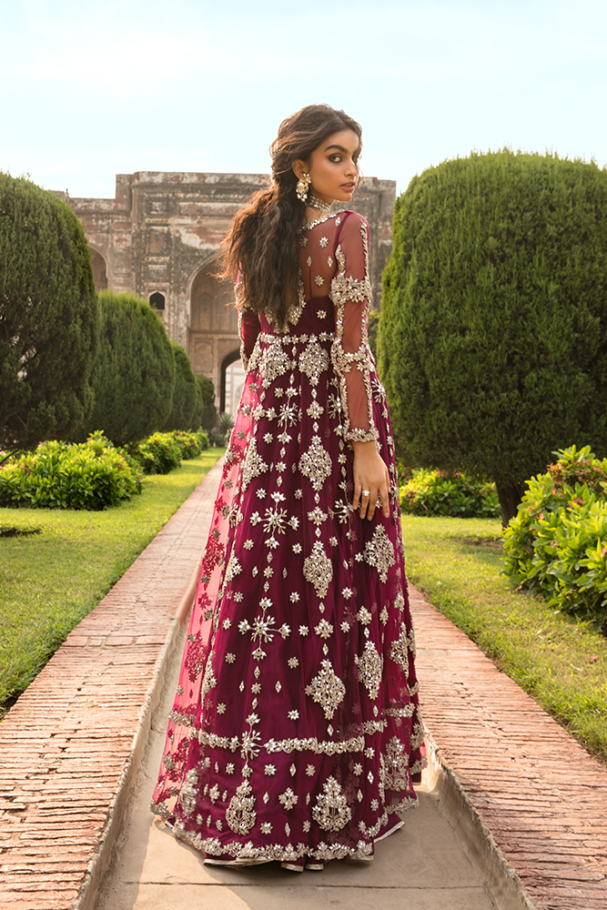 Description: Sheroz, honoring our heritage with a symphony of regality and tradition infused together brilliantly, on the Merlot hued pishwas. A tulle canvas embellished with exquisite patterns, inspired by the handiwork of many historic mughal architectures. The flamboyant pishwas, further accentuated by gleaming mirror and chrome tilla work, forming an utterly exquisite silhouette leaving nothing else to be desired.