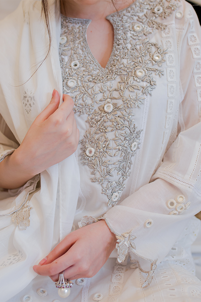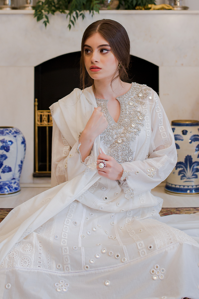 Description: A delicate Chikan lawn shirt with tilla embroideries and mirror work to glam up the festive look. Paired with cotton block printed dupatta and trousers.