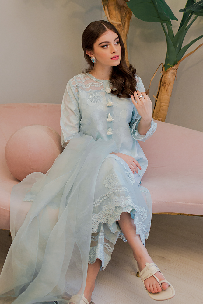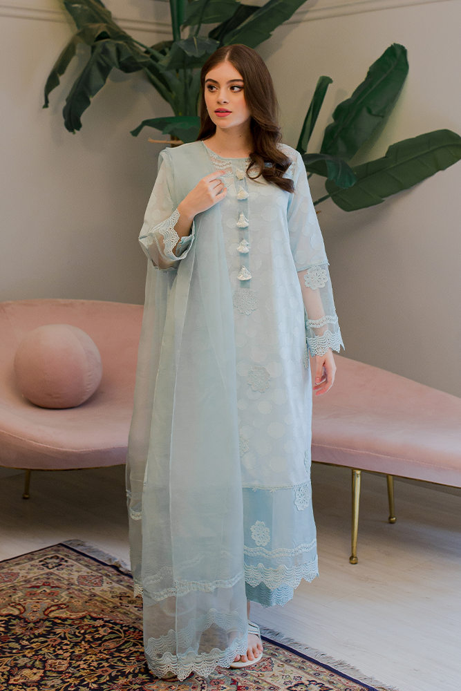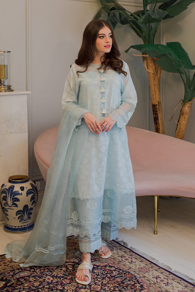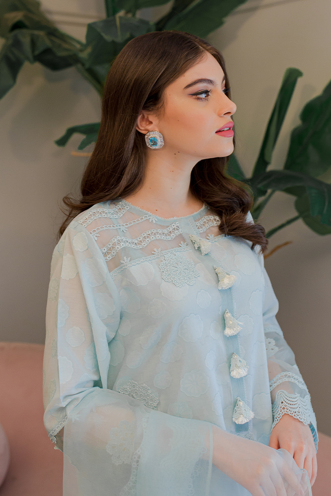 Description: Blue Mist is crafted on embossed shirt with delicate details paired with an organza dupatta and cotton trousers with organza details.