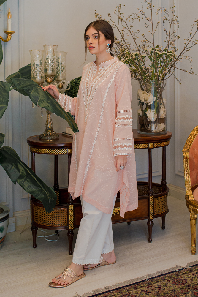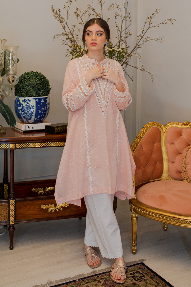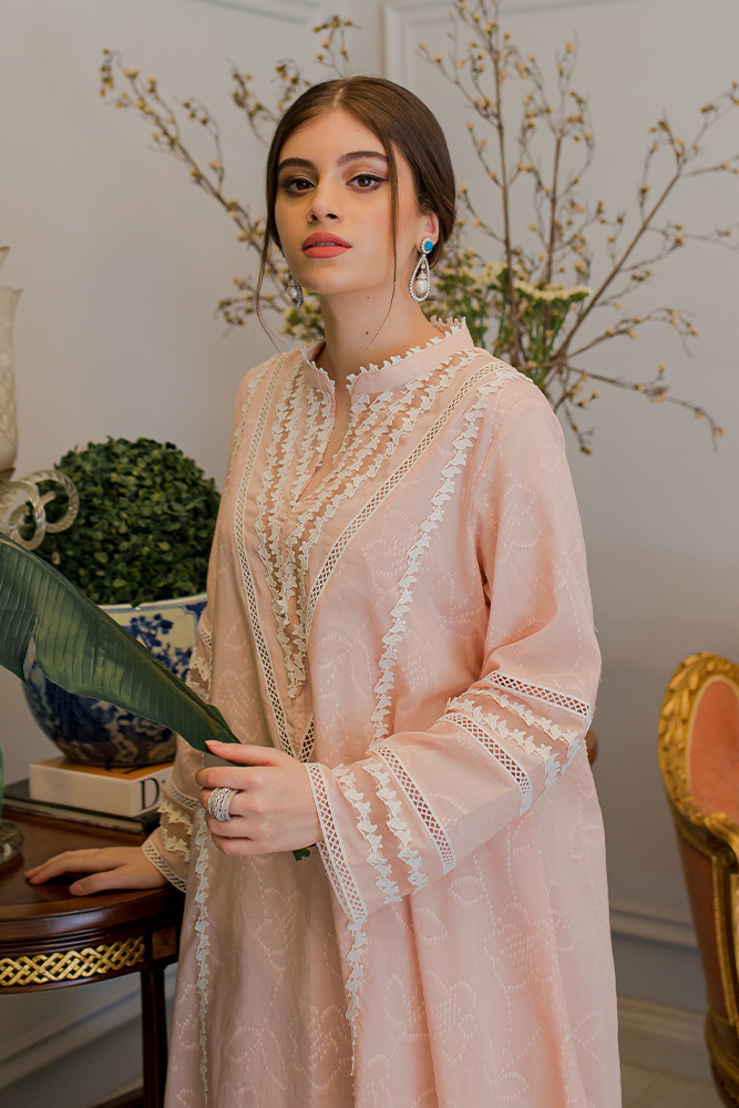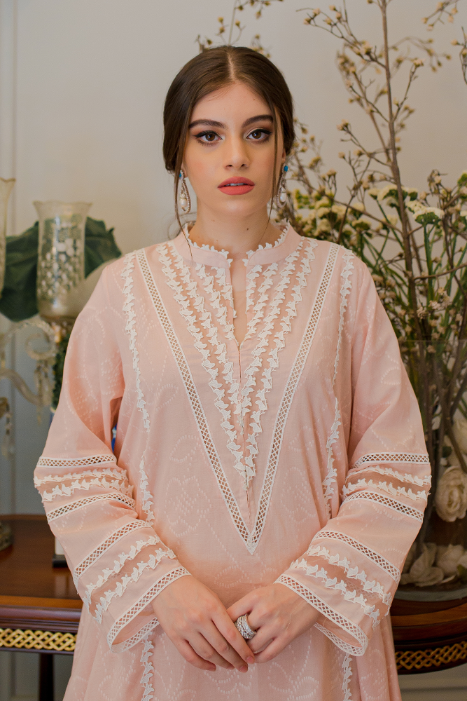 Description: Our signature embossed cotton shirt with organza details around the neckline and sleeves paired with a cotton shalwar to complete the look.