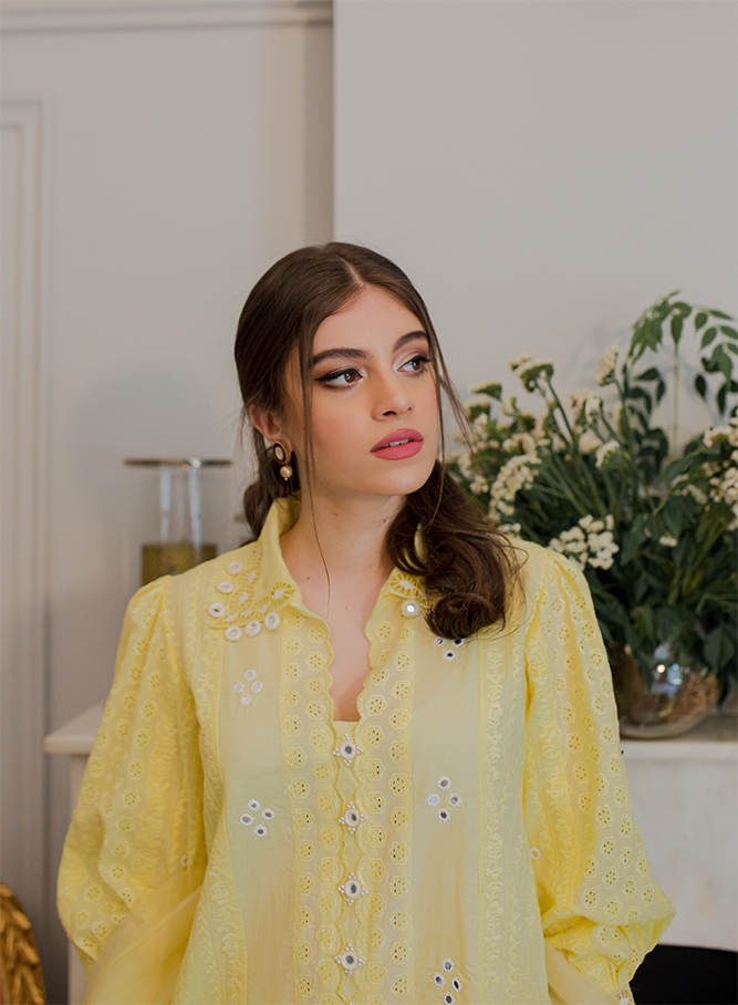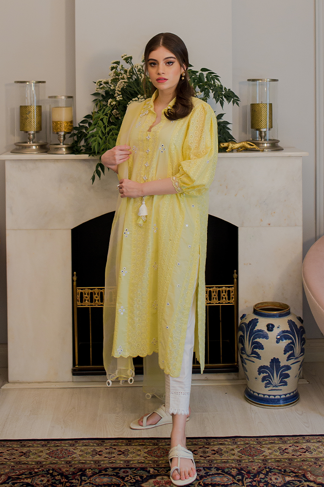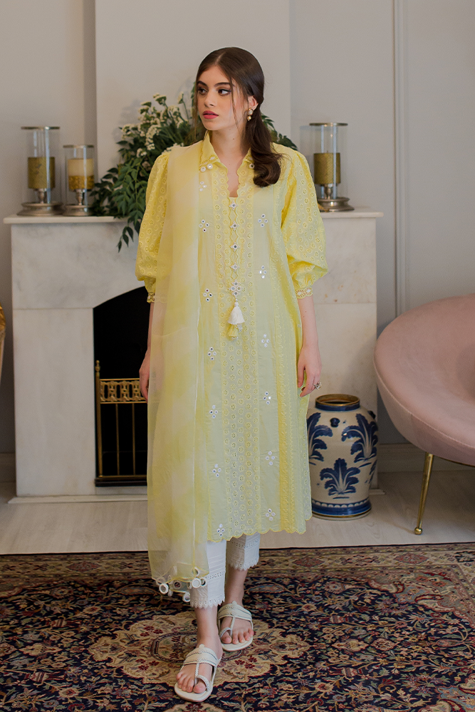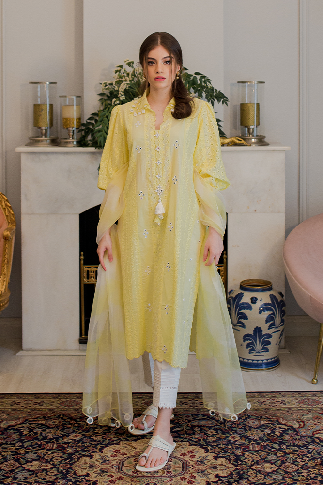 Description: Crafted with utmost perfection- This chikan lawn shirt with mirror work and embroidery detailing on neckline and sleeves is paired with cotton pants and organza dupatta.