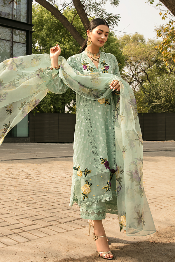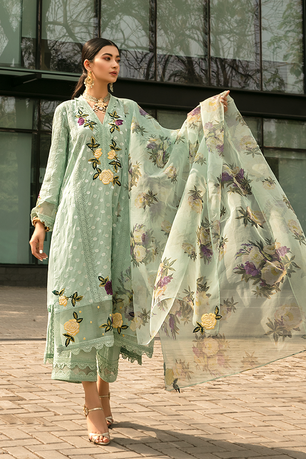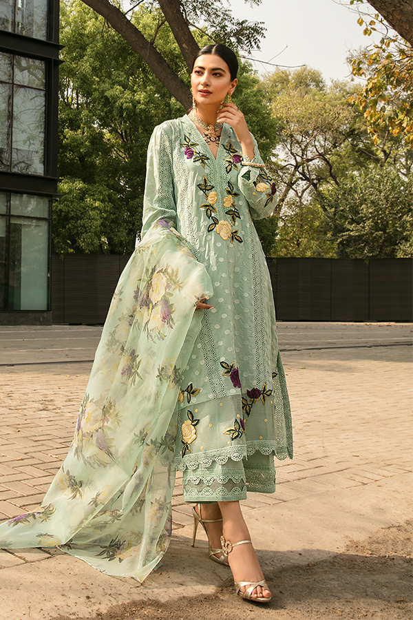 Description: Spring Affair presents a minimalistic yet ethnic display of grace in this sage green chikan and cotton shirt with the blooming flowers layered on the neckline, sleeves, and daman. The similar hued floral organza dupatta is paired with azaar pants creating a dreamy look elaborated to perfection.