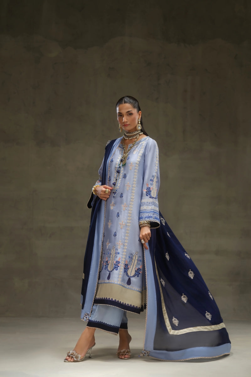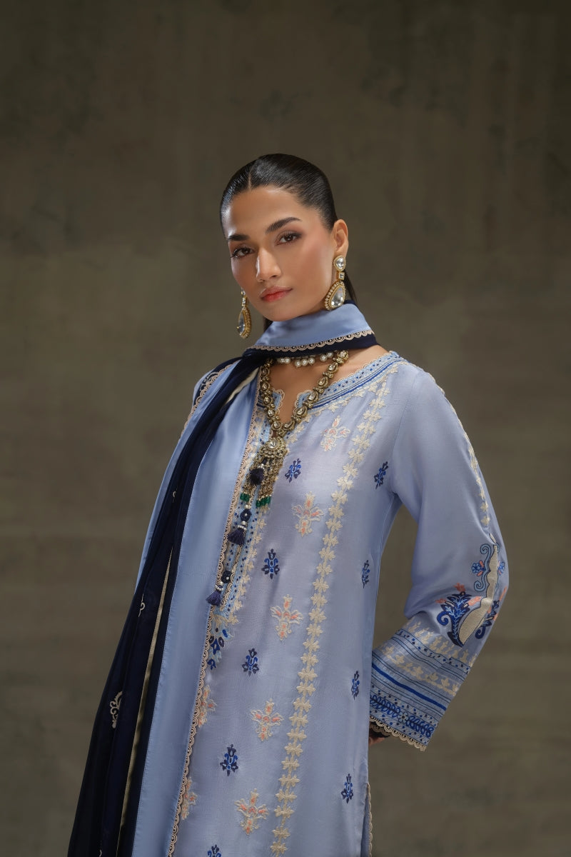 A graceful pure raw silk kalidaar kurta adorned with intricate arri embroidery. Paired with a pure raw silk azaar featuring satin and embroidered borders. The look is completed with a pure silk dupatta, elegantly finished with satin edging and embellished with block print motifs.