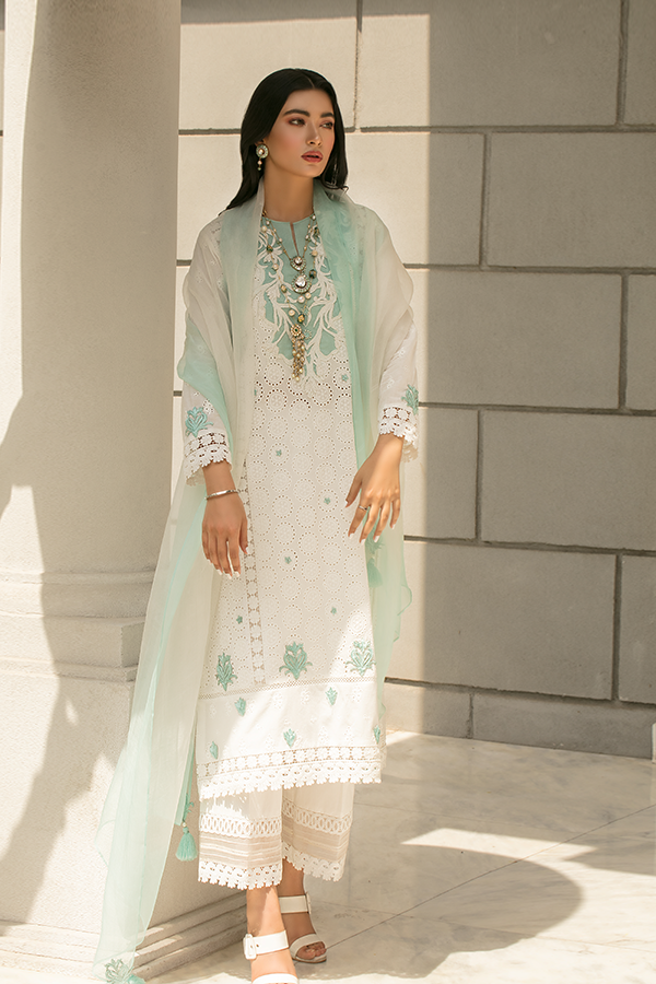 Description: With the captivating embellishments and ethnic detailing layering the whole canvas, Teal is composed of a charming white chikan kurta enhanced with a ferozi hued organza patch on the neckline along with ferozi hued flowers at the daman. Paired along is a beautiful dual-toned organza dupatta and cotton azaar pants adding to the grace of the look.