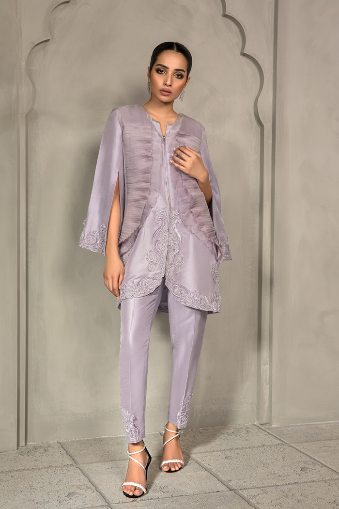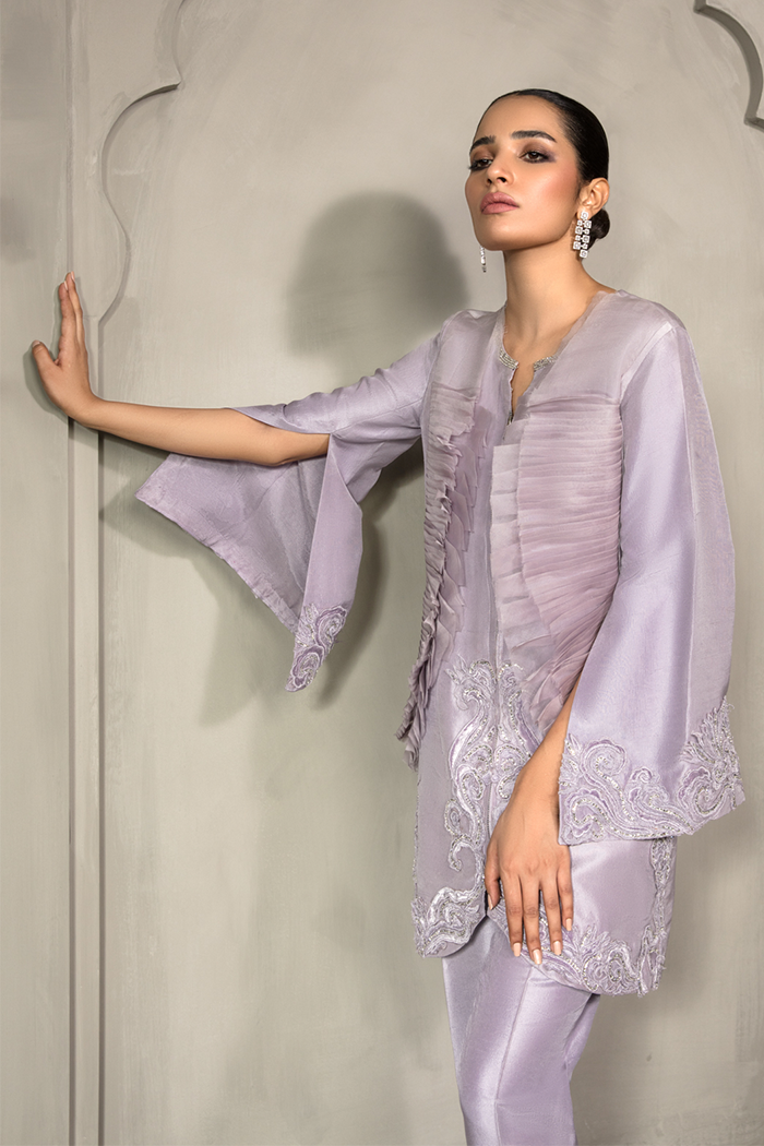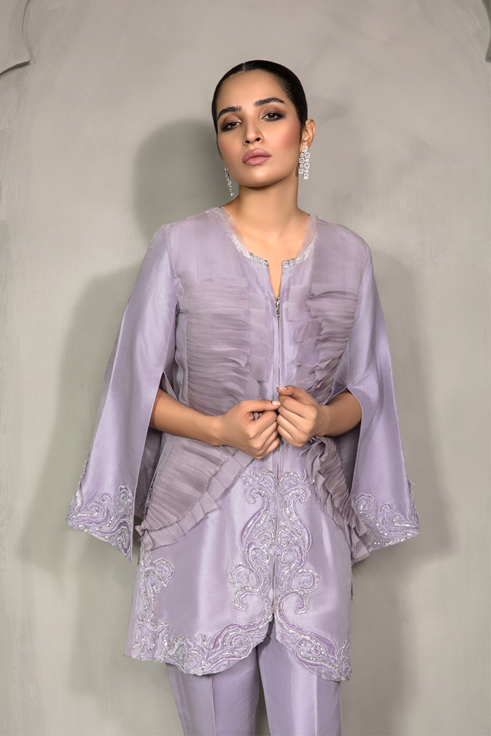 French modern cut jacket in fresh lilac color with pleated detailing on front and work applique on sleeves and daman, embellished with Swarovski’s.