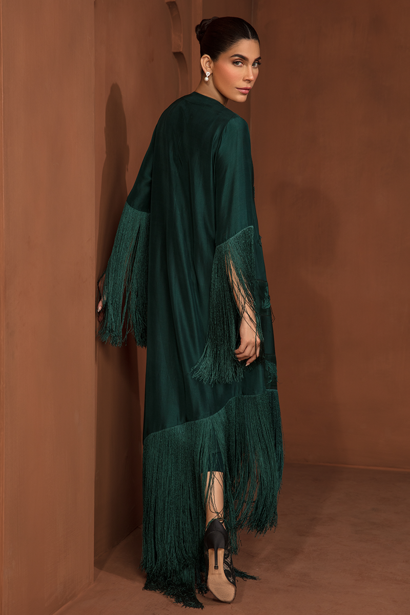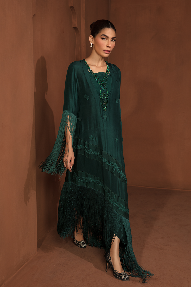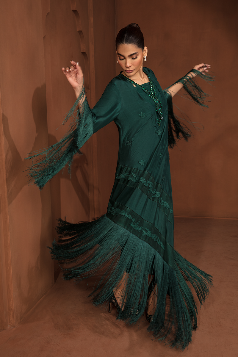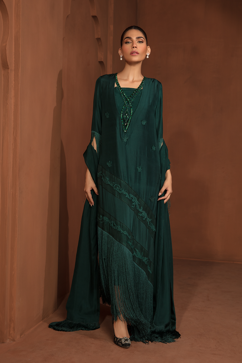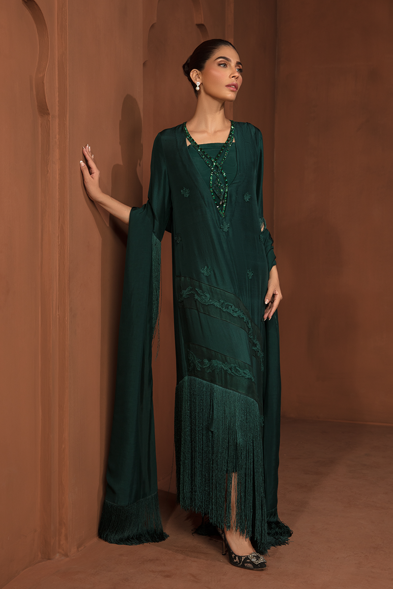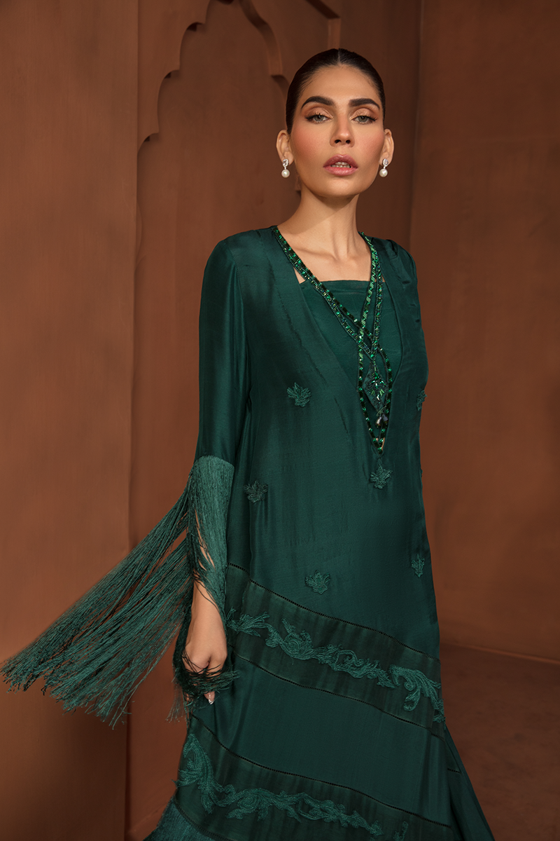 Description: "ZAHA" is an enchanting masterpiece on a Green canvas. The raw silk shirt, adorned with exquisite flowers and embroidered appliqué, shimmers with pearls and sequins on the neckline. Paired with raw silk trousers and a silk dupatta, "ZAHA" captures the essence of elegance and natural beauty.