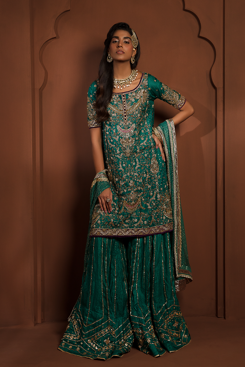 Description: Unravel the golden and green whispers of “ZEB-UNNISA”, as you step into an enchanting world of beauty. The celestial Self-embossed Jamawar shirt and lehnga, adorned with Gotta, Dabka, Naqshi, Sitara, and Moti work, glistens like dew drops on a midnight.. The Chiffon Dupatta, softly embellished, gently caresses you like a cool breeze, making you feel at ease on your special day. Let Zeb-Un-Nisa be the embodiment of your inner radiance and beauty.