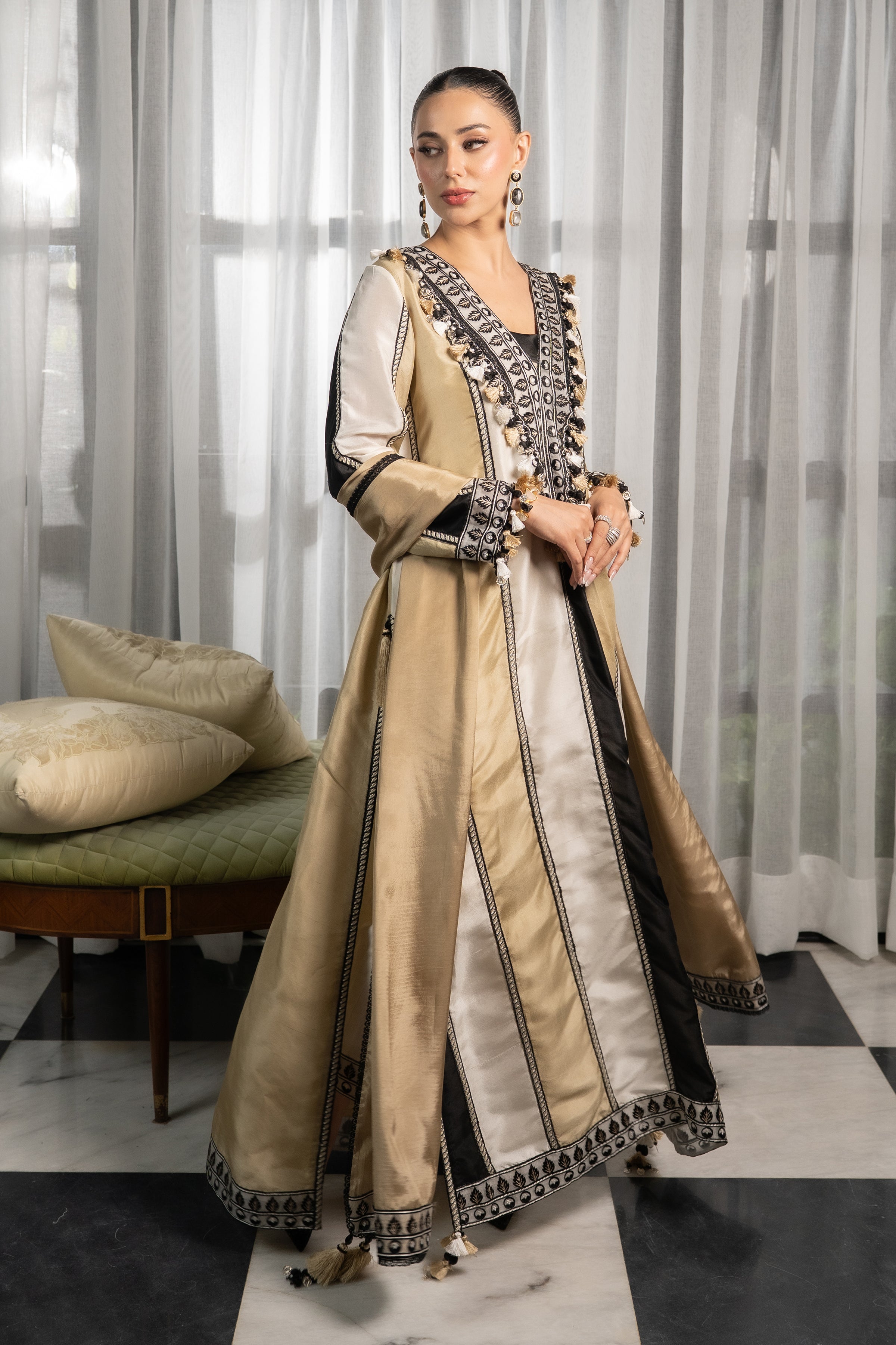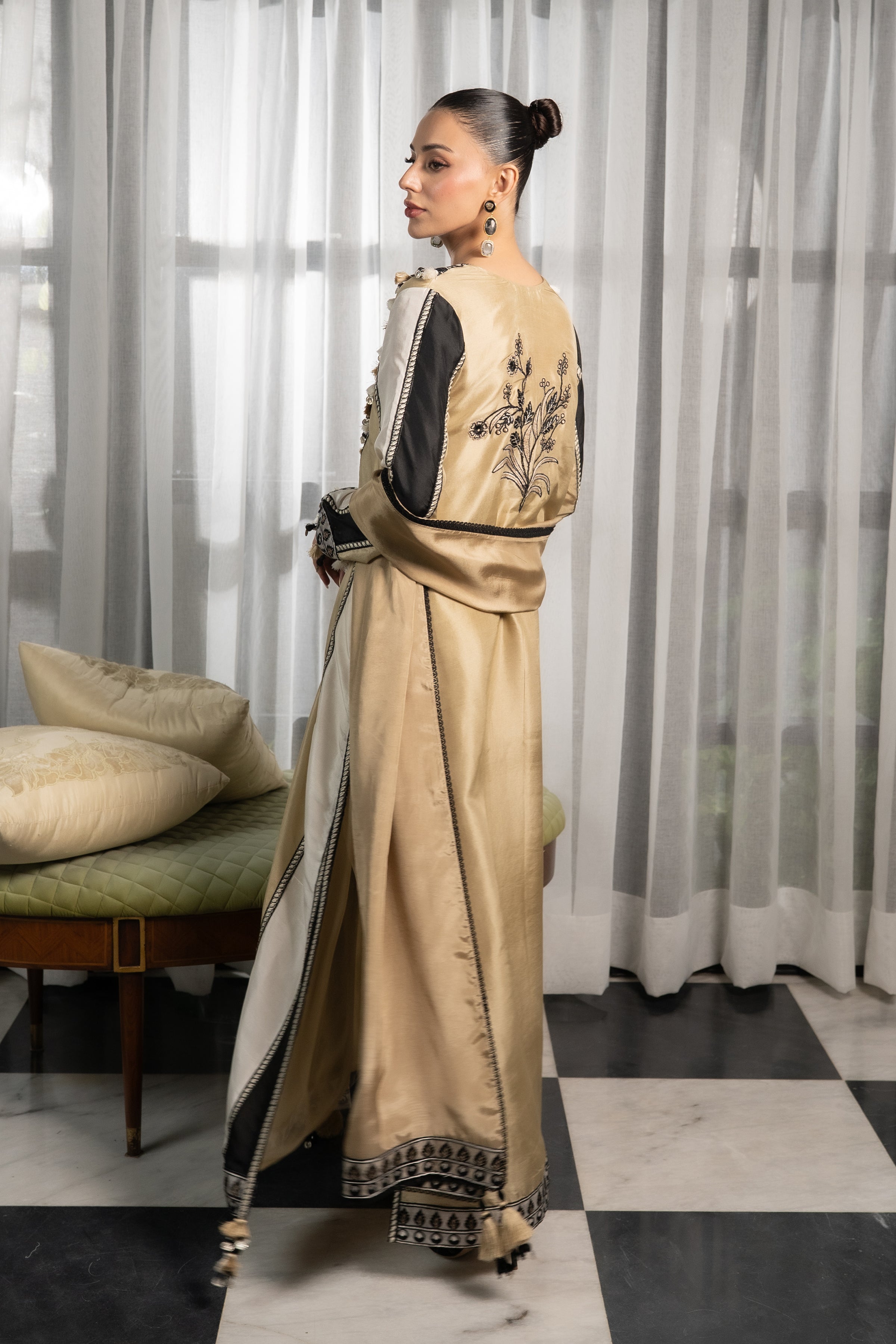 This elegant ensemble features an asymmetrical pure chiffon shirt in a soft, neutral shade. The shirt is designed with unique satin raw edges and an exquisite Swarovski neckline. It is paired with complementary flared Korean rawsilk pants. A flowing chiffon dupatta with matching satin raw-edges and Swarovski completes this stunning look.