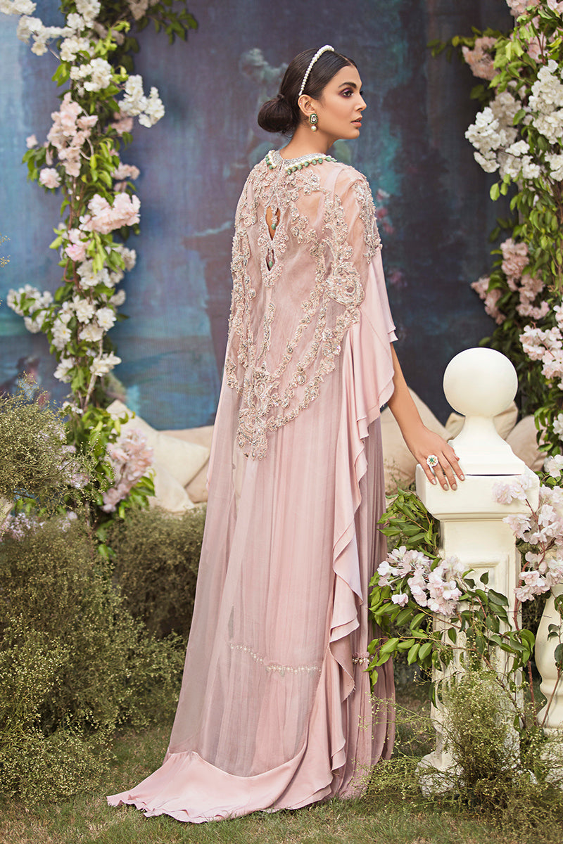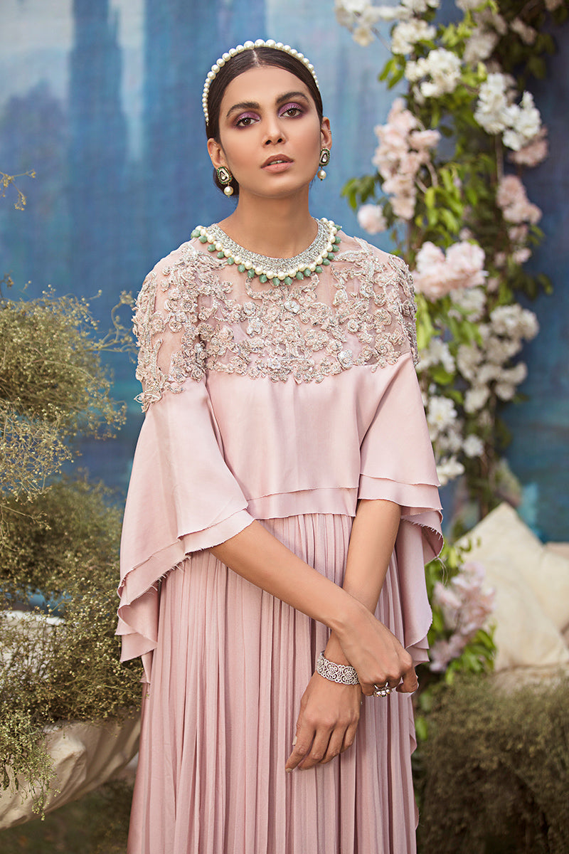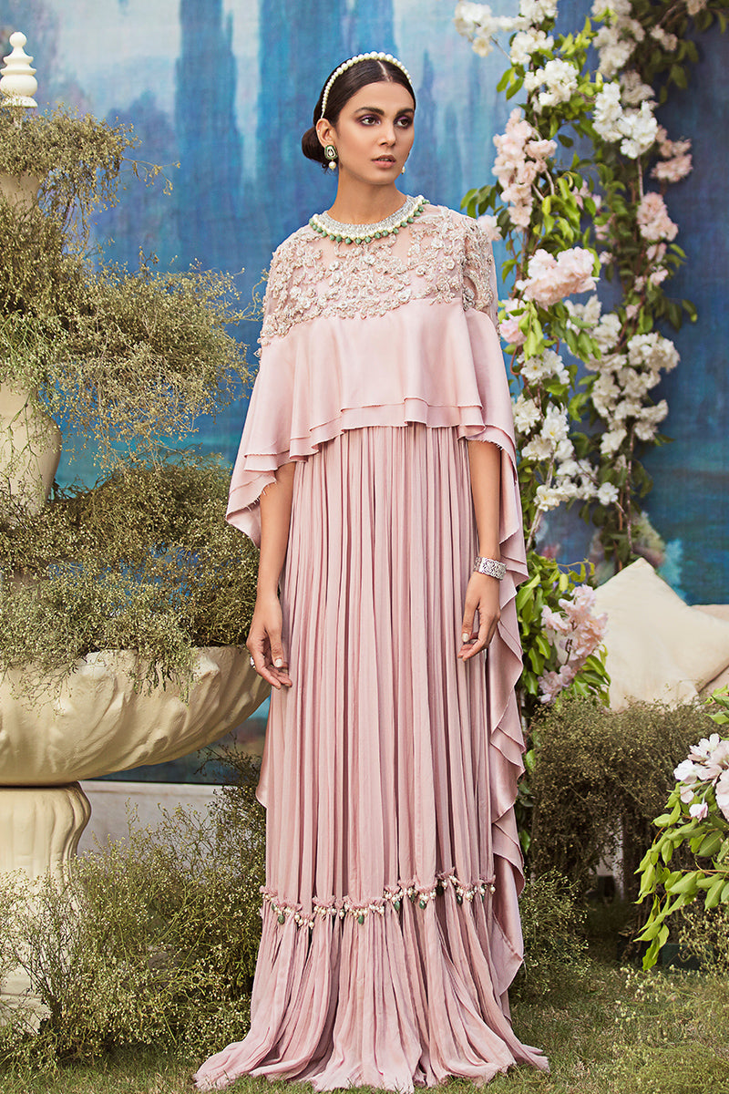 Description: Ethereal, über feminine, and flawless. Alayna - our georgette chiffon pleated gown layered with 3D floral embroidered details in Austrian Swarovski’s, dabka, and nakshi, adorned on organza and satin flowy trailed cape, with a bejeweled neckline. Every aesthetic detail of this outfit infuses exquisite craftsmanship with modern glamour.