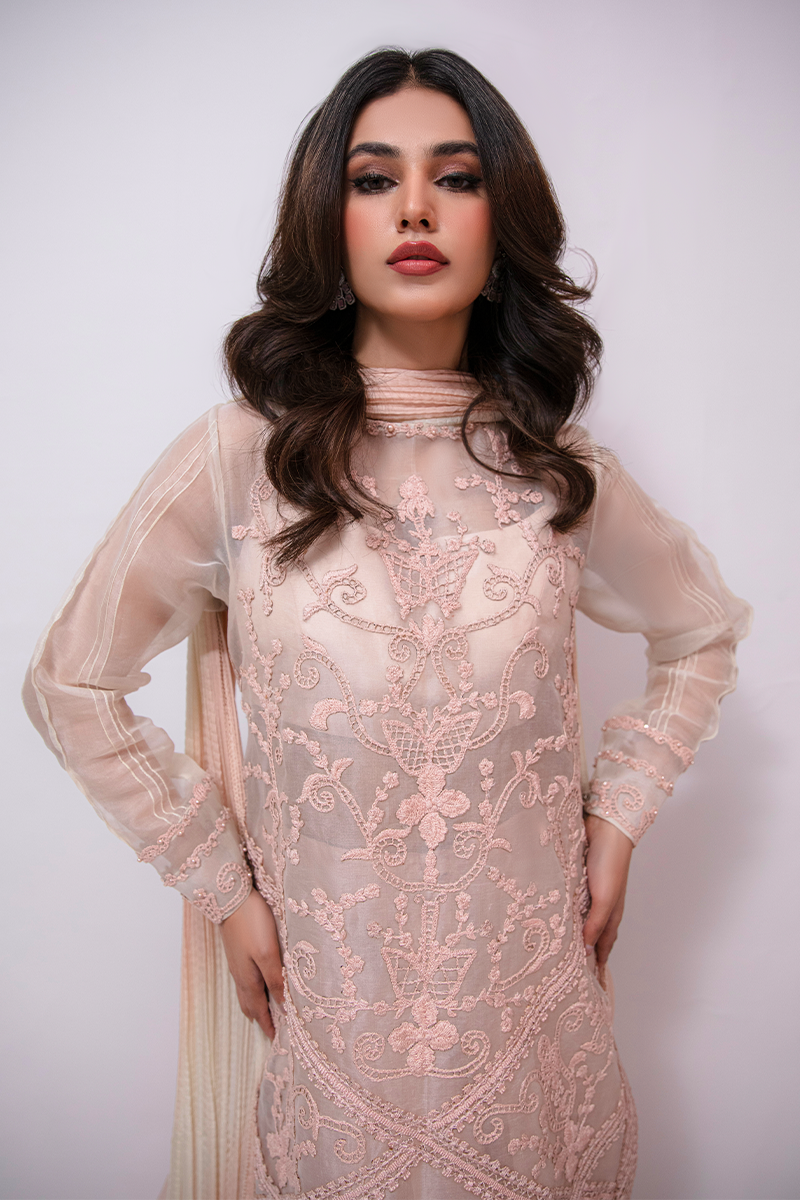 Description: Enriched with delicate embroidery of self-color on a pastel pink base, Ariana Pink is a mesmerizing ensemble adorned with embroidered floral patterns. Paired with flared pants along with crush shaded dupatta, this outfit is bringing timeless charm to life.