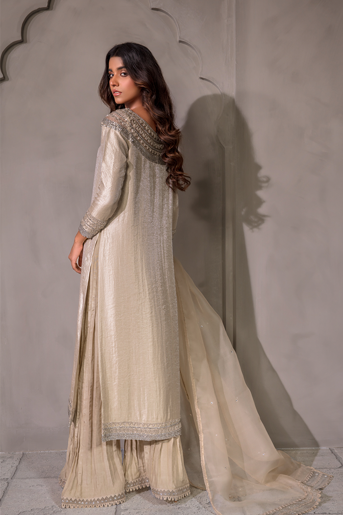 Gold colored silk lama shirt beautifully embellished with Swarovski’s and sequence worked paired with crush pants and organza dupatta with Swarovski’s chan and lace detailing.