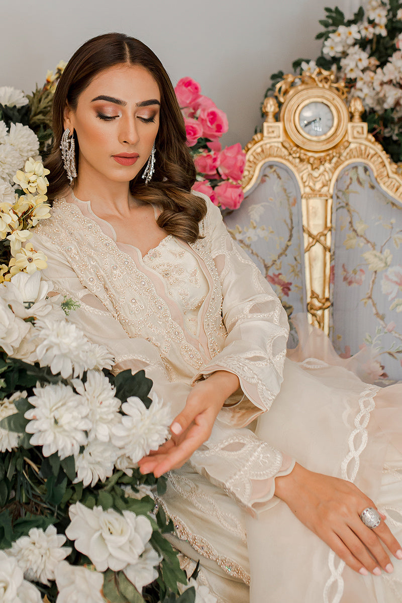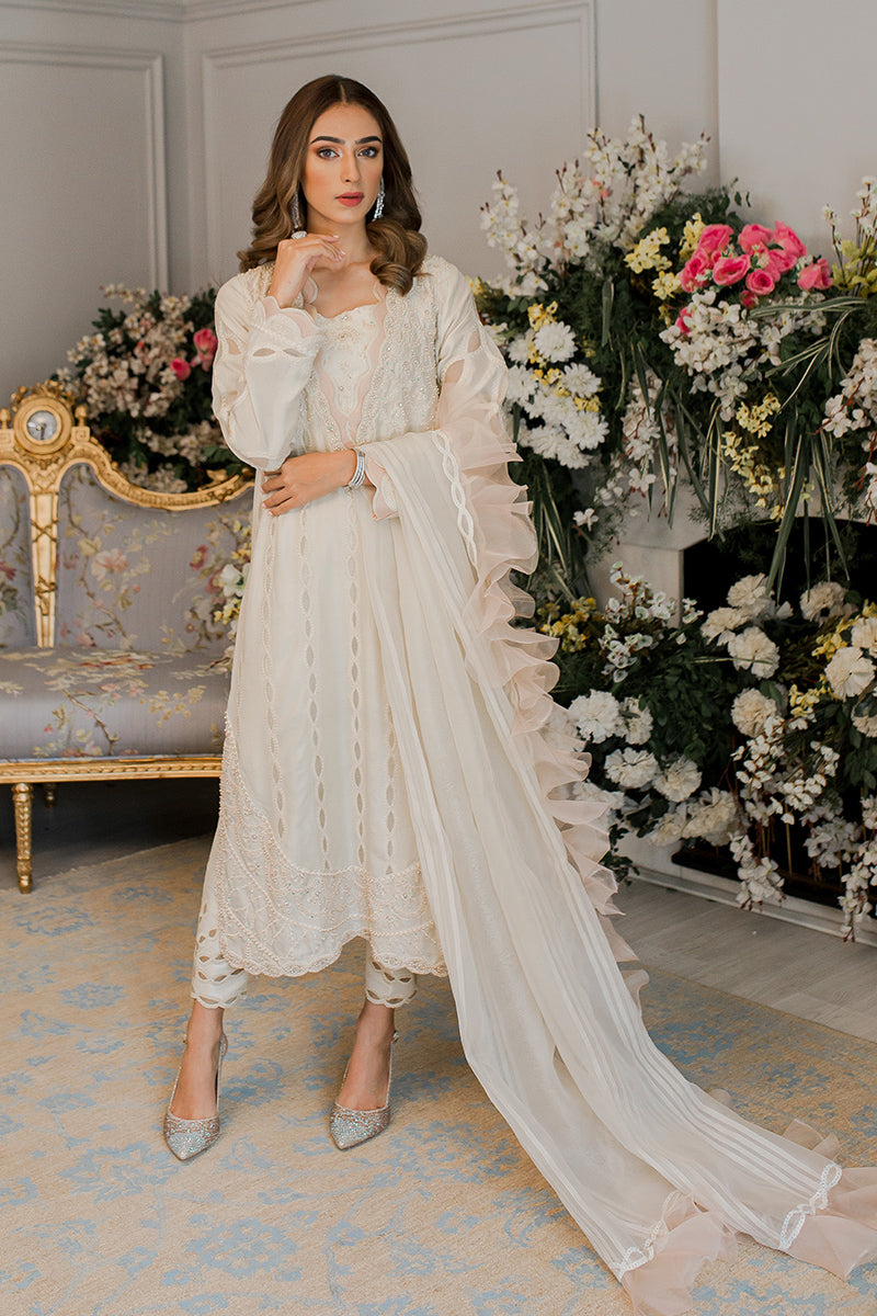 Description: The charismatic ivory and peach-hued work of art is handcrafted with intricate embroidery on the shirt. This classic ensemble is paired with elegant raw silk pants with a graceful organza dupatta making the attire the perfect fit for your summer look.