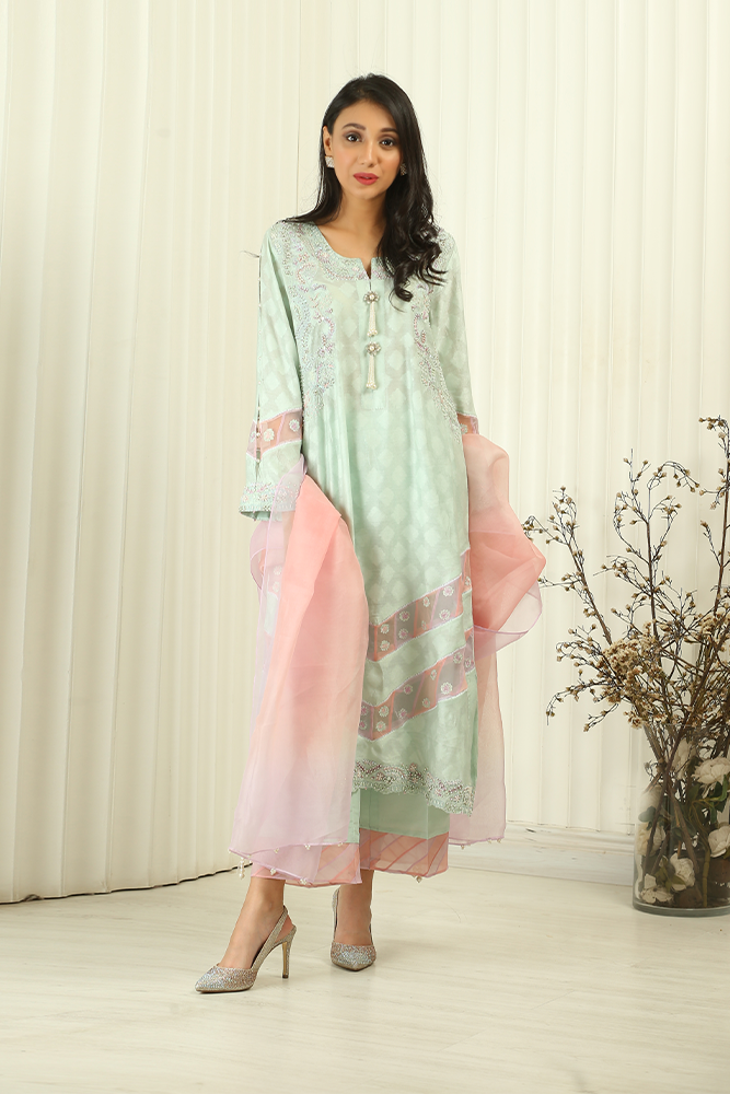 Description: The Aqua blue embossed silk net shirt shows off sophistication and the elegant Organza shaded dupatta with pearl embellishments will make you stand out in the crowd. The attire has intricate embroidery on the neckline which is eye-catching and flattering and a perfect choice for you this season. The cool summer ensemble is adorned with organza inlay borders on the shirt and is paired up with an azaar.