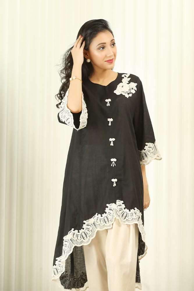 Description: The black, high front low back, tunic is your go-to summer dress as it will keep you cozy and stylish all day. The carefree and effortless ensemble with beige lace appliqué exudes a cool vibe which perfectly goes with the season. The pearl embellished detail on the neckline is pure flattering. Lastly, the attire is complemented with shalwar which makes this a perfect dress which will stand out and turn heads.