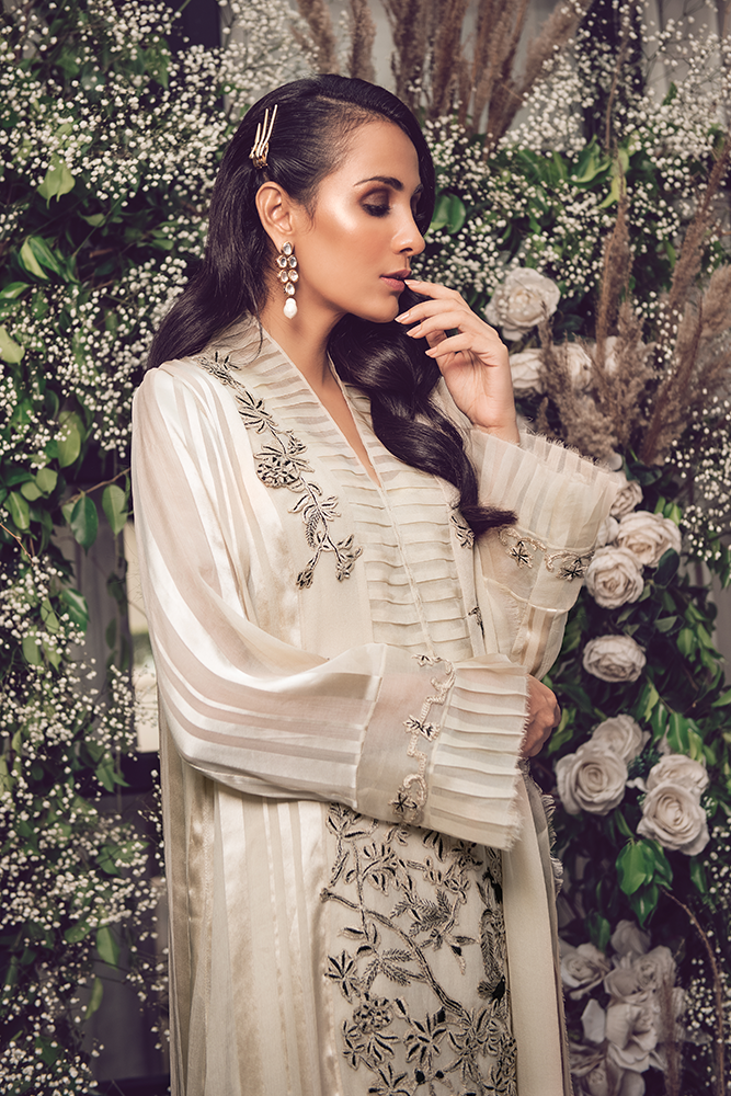 Description: Beige chiffon and silk with embroidered front and organza pleating border. Paired with chiffon dupatta and silk pants.