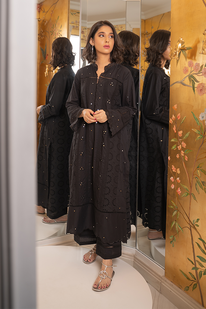 Description: This ensemble comes with a touch of some exclusive mirror work with the finest quality of chicken lawn. The exqusite combination of azaar to the black attire gives a new meaning to grace and elegance defined together. A tale of delicacy along with intricacy. The beautiful hand crafted mirror work with the finest embellishments creates a divine look.