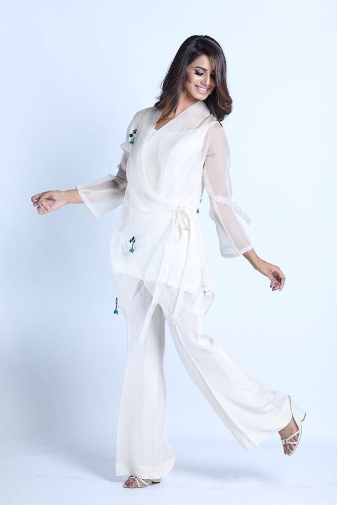 Description: This tissue fabric white wrap around organza jacket with the most elegant crystal hanging embellishments details creates the purest definition of elegance. This jacket is paired with boot cut pants that makes this outfit an exqusite duo of grace and elegance .