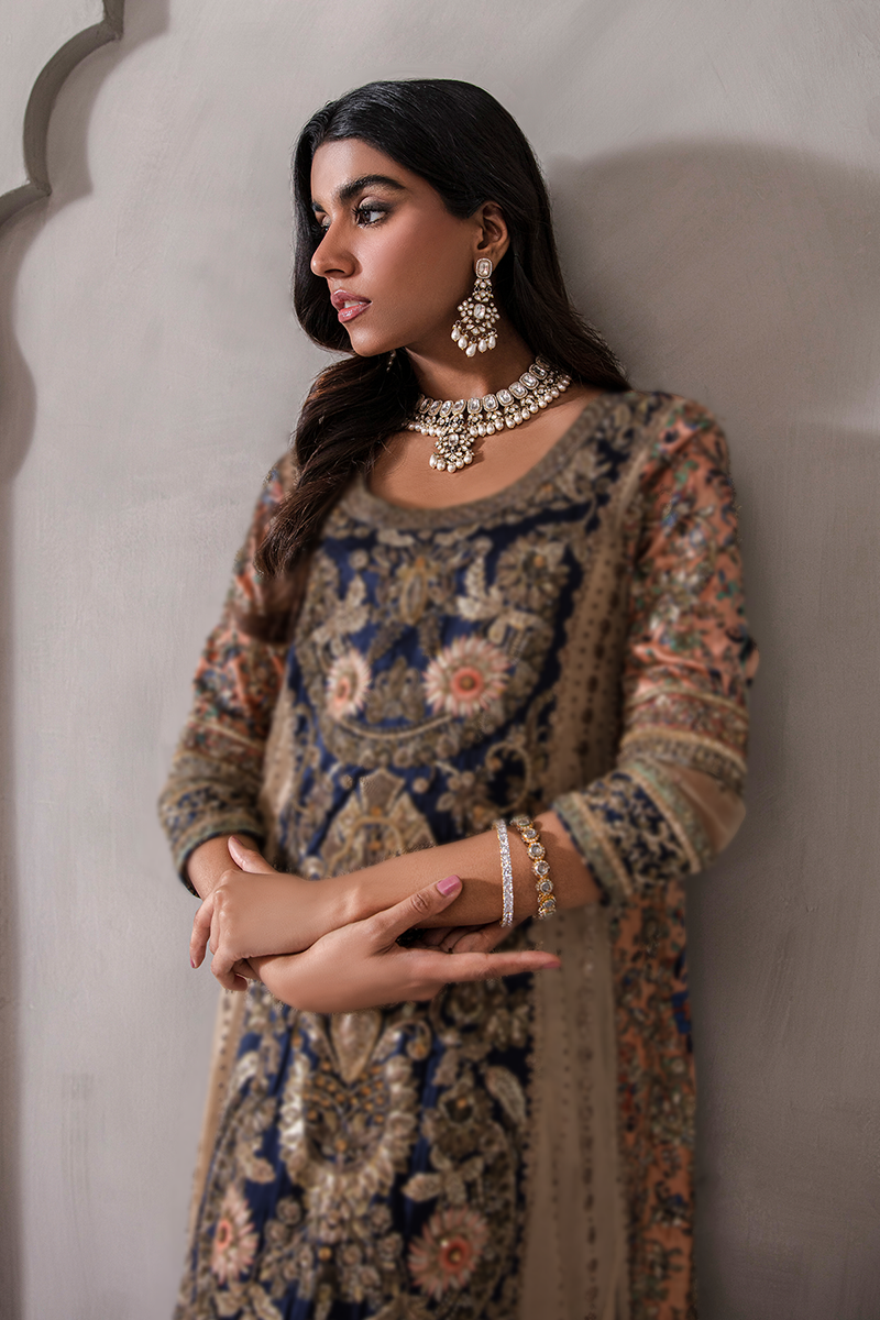 Description: Unleash your inner diva with this heavenly ensemble! The long shirt, filled with exquisite traditional work of gotta, dabka, naqsi, and sitara, captivates in royal blue and beige hues. The net mukesh and blockprint panels bring a contemporary twist, while the majestic blue kimkhab azaar with its embellished borders exudes sophistication. Adorned with a vibrant blockprint dupatta, this outfit is a statement of elegance and panache.