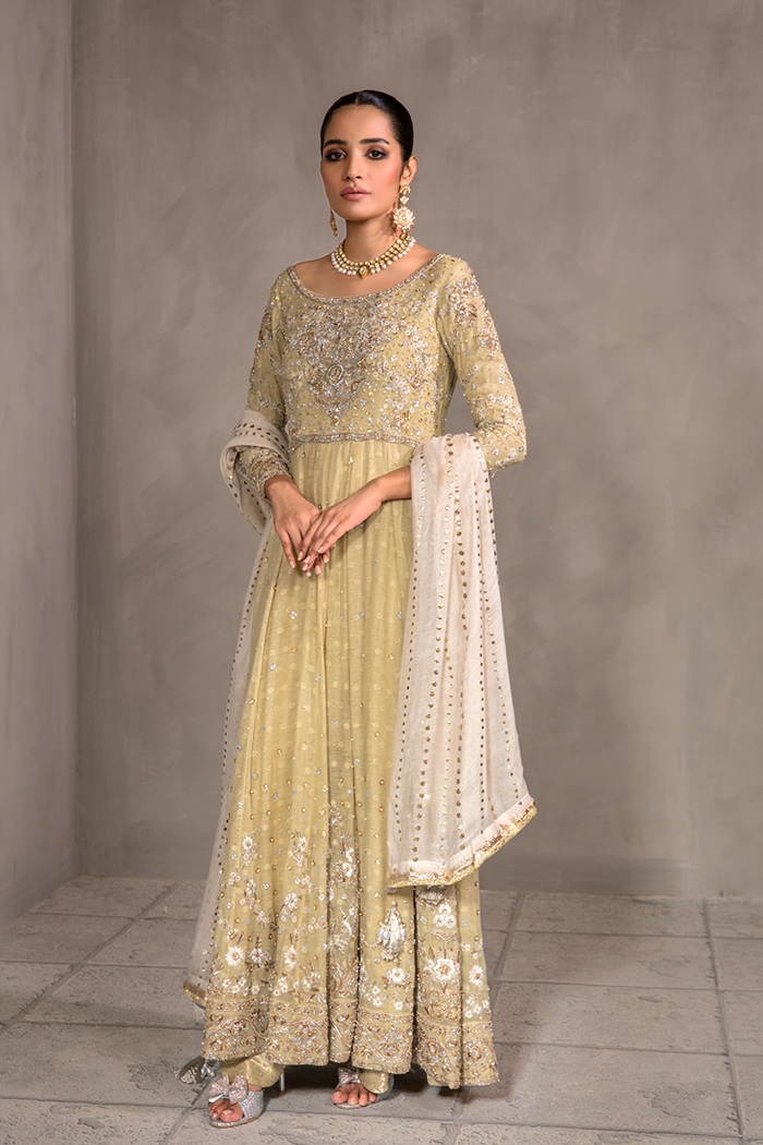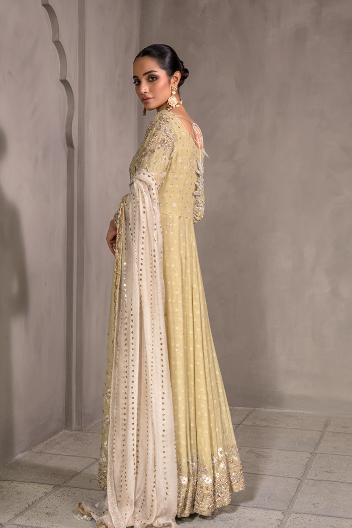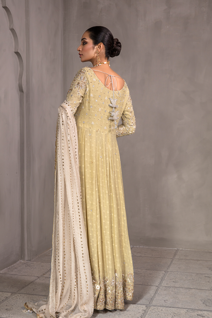 Yellow lime colored cotton net full length pishwas with fully worked bodice heavenly filled with traditional work like dabka, sitara.