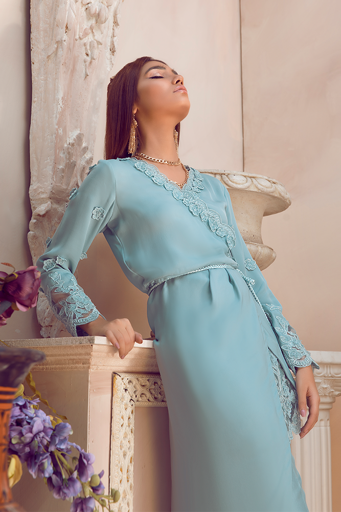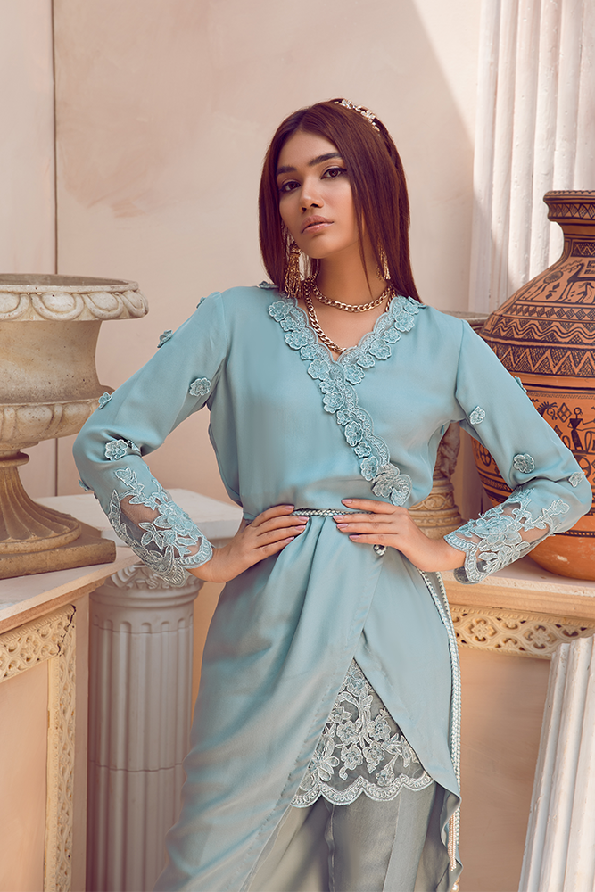Description: Blue-colored malai crepe embroidery dress with a long back flare paired with pure silk pants.