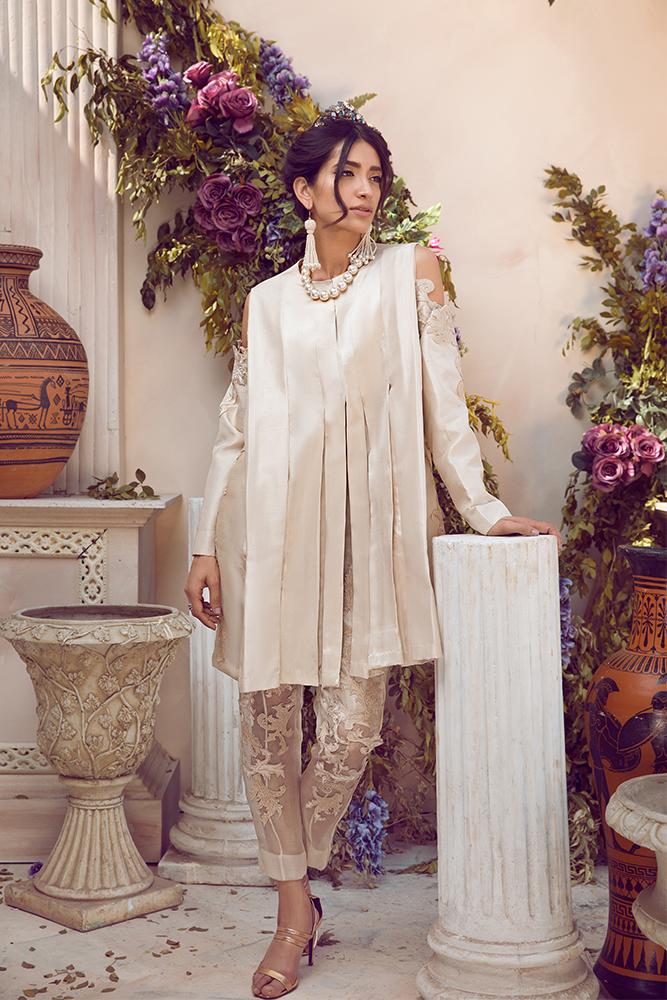 Description: The intricate organza pants and the loose-fitted shirt with cold shoulder sleeves and velvet applique work. The ivory color marks the strong identity of this glamorous outfit which is at its best in giving a global feminine feel.