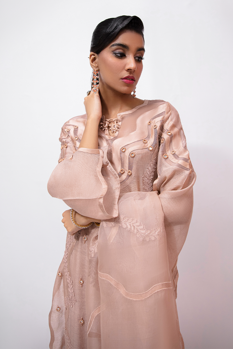 Description: With an enchanting blend of gleaming embroidery and finely detailed patterns, Pink Haze features a fine base of the fresh peach cotton net for the shirt and is decorated with intricate embroidery and mirror work detailing of self-colored thread. Paired with fine silk pants and a stunning organza dupatta with similar work details, this outfit is concluding elegance at its best!