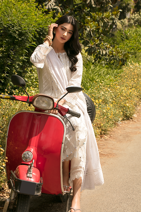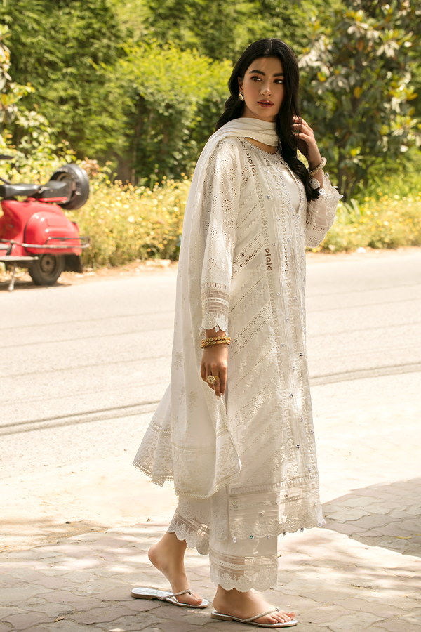 Description: Porcelain endorses a tale of delicacy along with intricacy with its contemporary silhouette. The white chikan kurta is ethereally enhanced with mirror work finishing and laces. Paired along is a lovely cotton embroidered dupatta and cotton azaar pants, creating a subtle yet dreamy look.