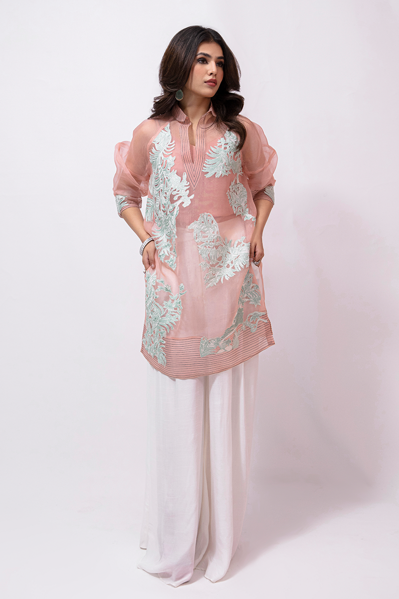 Description: Royal Luxe features a fresh peach-toned organza shirt adorned with delicate ferozi-hued embroidery. The shirt is detailed with an intricately embellished panther and floral applique on the front and sleeves. The gorgeous shirt comes with flared silk white pants and a stylish shaded scarf along with fabric tassels finishing that gives this outfit a perfect fusion of traditional and modern charm.