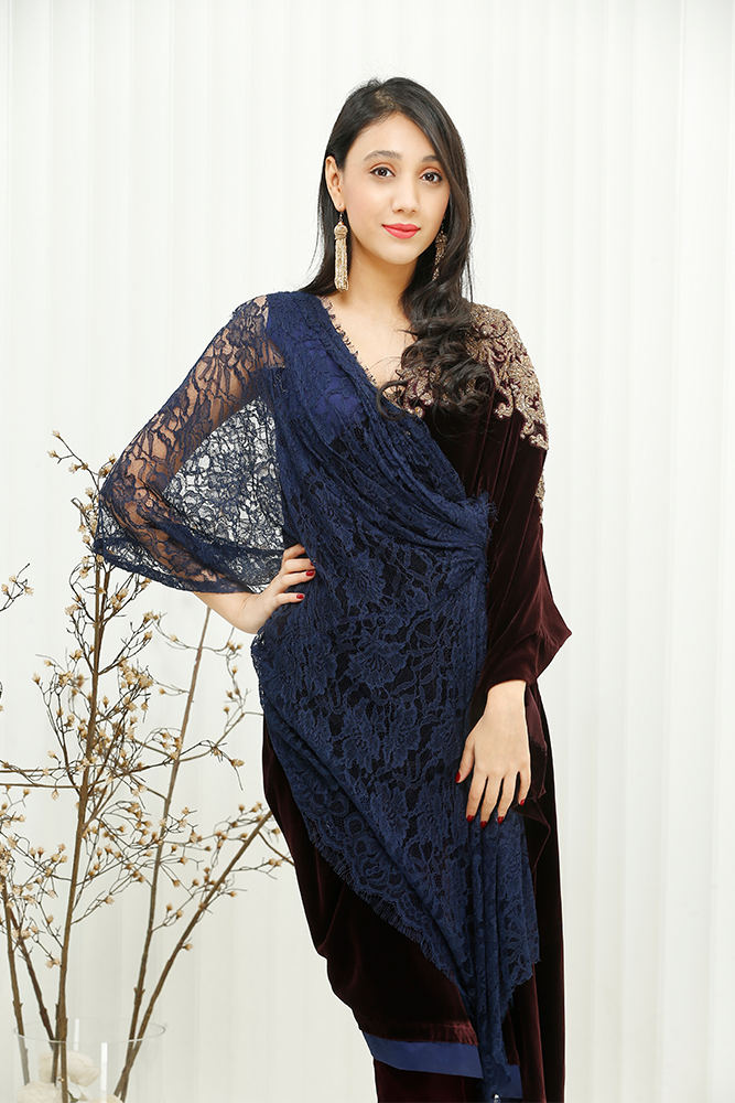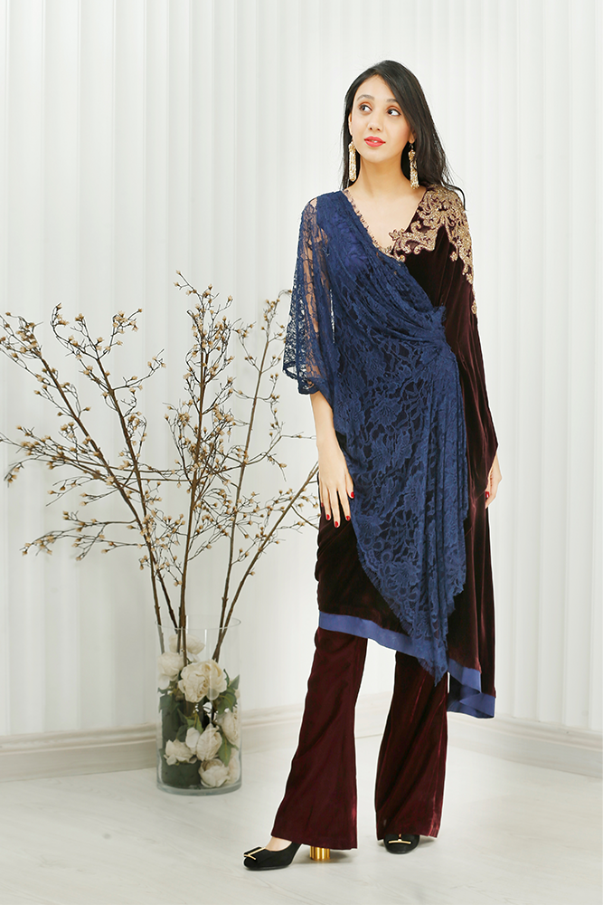 Description: This striking blend of Blue with a vivid pop of velvet kaftan combined with enchanting lace embellishments on the shoulder creates an ethnic look. The velvet boot cut pants compliment the dreamy look created from this outfit